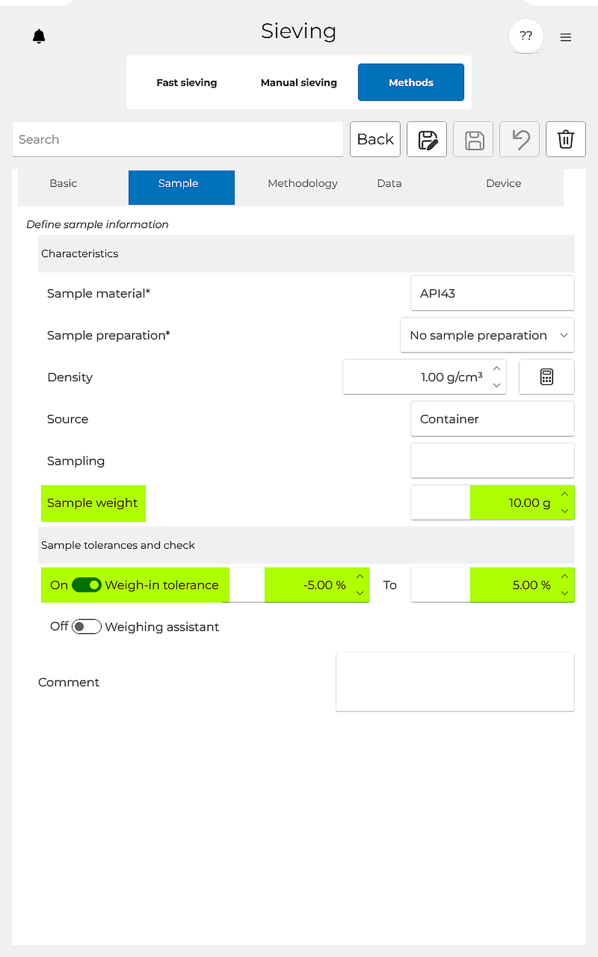 "Asistent vážení" lze použít výhradně s testovacími síty RETSCH a lze jej snadno aktivovat/deaktivovat v této metodě.