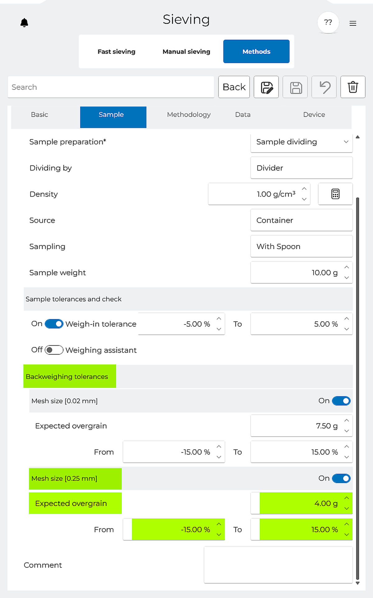 Vyhovuje váš vzorek předem nastaveným limitům kvality? Díky toleranci zpětného vážení můžete zajistit, že velikost částic a distribuce velikosti částic vzorku bude odpovídat vašim požadavkům.