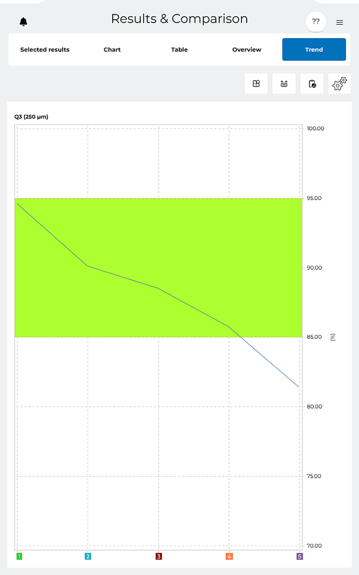 Analýza trendů umožňuje porovnat několik procesů sítování na základě volitelně nastavitelných parametrů. Díky tomu můžete těžit z jednoduchého a spolehlivého monitorování různých kritérií kvality.